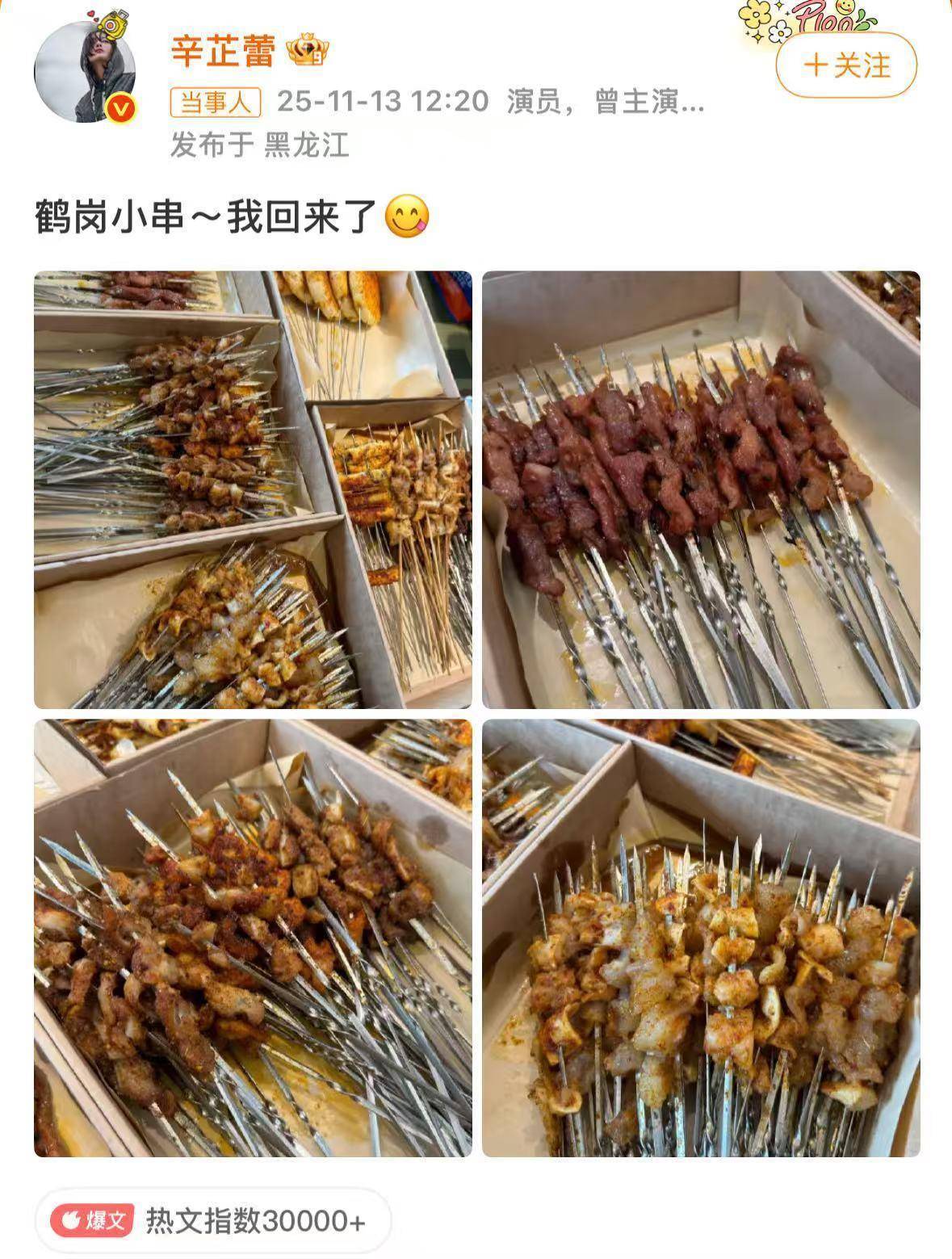 11月13日12时,演员辛芷蕾在微博晒出自己回到家乡黑龙江鹤岗吃烧烤的照片,并配文:鹤岗小串~我回来了,相关内容上了热搜。13日下午,极目新闻记者联系当地两家知名的烤串店获悉,当天中午,辛芷蕾团队工作人员联系其中一家店,请店方将烤串打包送至指定地点,正是她在微博上晒的那些烤串。不过,辛芷蕾可能吃得还不够尽兴,当天下午又现身当地另一知名烤串店品尝美食。当天下午5时许,店方称:“她刚离开。”