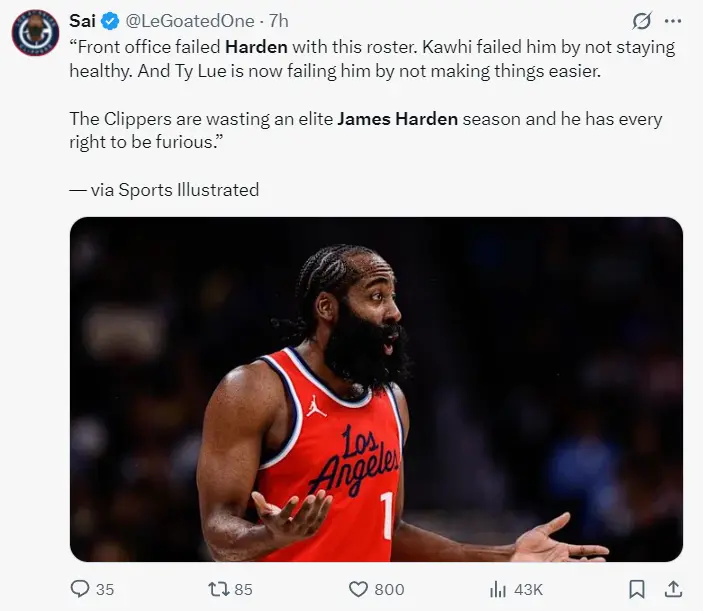 《体育画报》赛前:快船管理层打造的这套阵容辜负了哈登,伦纳德无法保持健康让哈登失望,泰伦卢也让他失望,因为泰伦卢没有让比赛变得轻松。快船正在浪费一个精英级哈登的赛季正规配资平台app,哈登完全有理由感到愤怒。