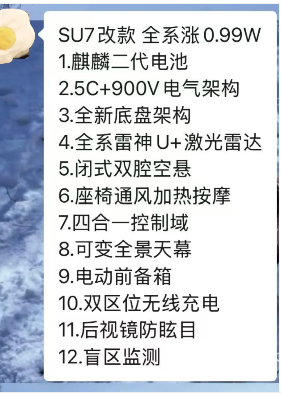 当小米SU7改款清单以“麒麟二代电池、5C+900V架构、全系激光雷达”等12项硬核升级刷屏时,“涨价0.99万”的信息却让不少用户陷入纠结。这场看似“加量加价”的产品迭代,实则是小米汽车在技术落地、市场定位、用户心理三者间的精密博弈,每一项配置的增减、每一分价格的浮动,都折射出新能源市场从“价格战”到“价值战”的深层转型。