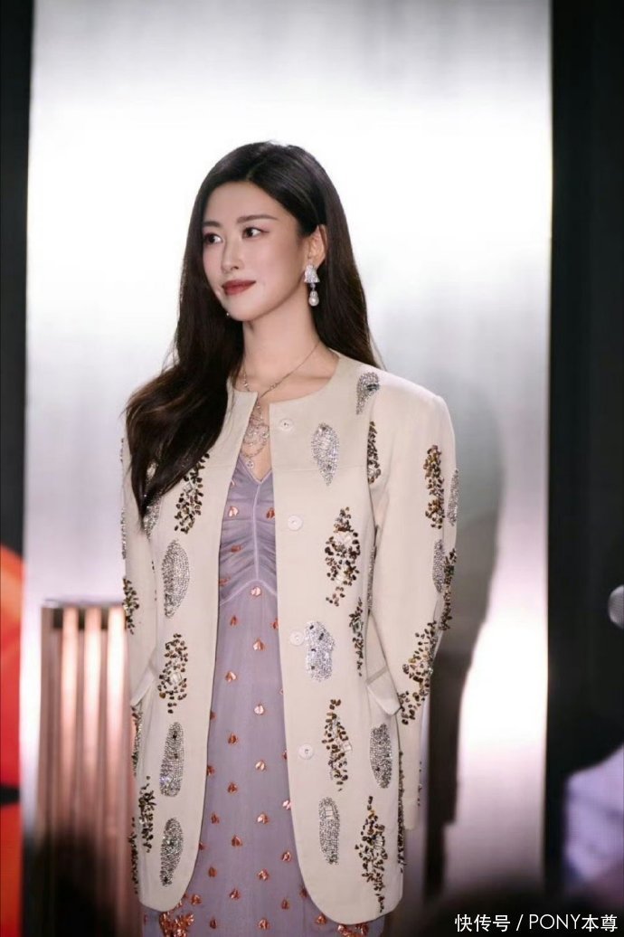 内搭的长款紫色纱质礼服裙则为整体造型注入了浪漫与妩媚气息。轻盈的纱质面料自带飘逸感,行走间裙摆随风微动,尽显灵动之美;紫色则是极具氛围感的颜色,既不张扬,又能凸显独特品味,与米色外套形成鲜明却和谐的色彩搭配,让整体造型层次分明。长发披肩的发型设计,进一步强化了温婉气质,与整套穿搭的风格完美契合,让朱珠宛如从古典画卷中走出的美人,妩媚又端庄。